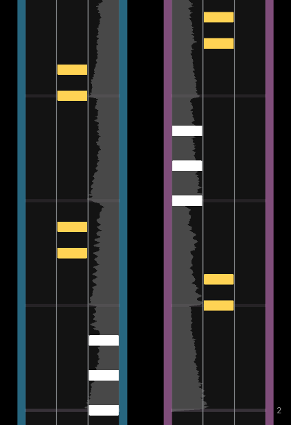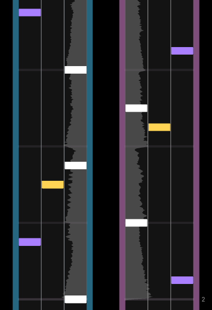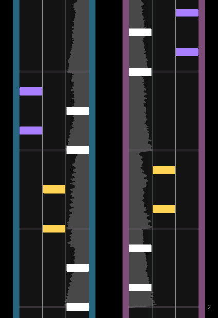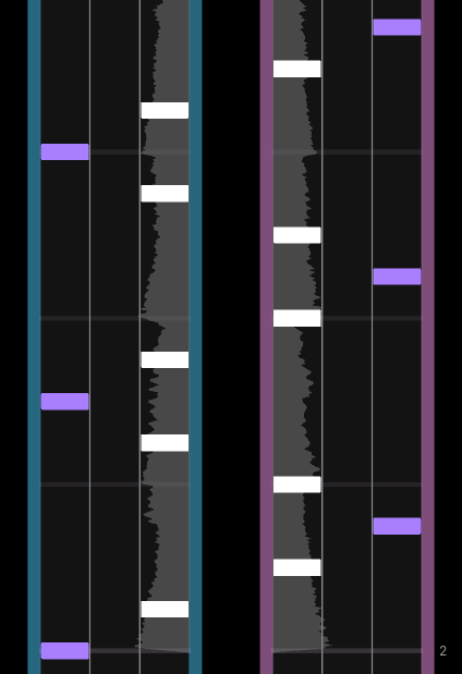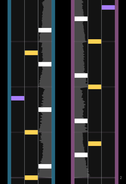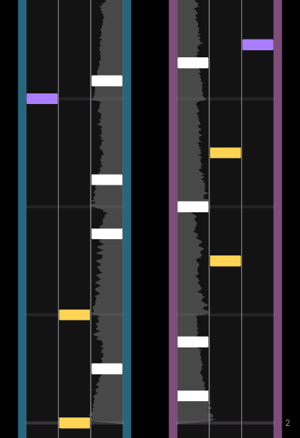Trills![]() | Patterns where the player must rapidly alternate between two notes. Can use both hands or one hand. Can be broken up with additional notes to represent a different percussion. Use Examples: Frontliners HY, Candyland EX |