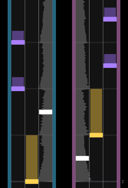 Chords![]() | Patterns where multiple notes land have the same timing and therefore must be hit simultaneously. Can either be one one side of the track (one-handed) or cover both sides of the track (two-handed). Use Examples: Knights of Khronelia EX, Waiting HY, HYPRWARP HY |